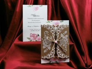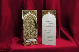 9158 Zarf Şeklinde davetiye koyu krem renklerinde ve yaldızlı penceresi mevcut yelda ve tezcan davetiyesi