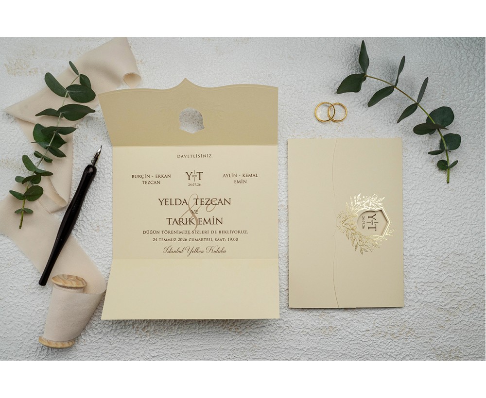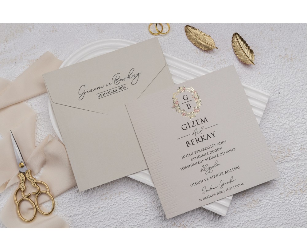 Özel Zarflı 9227 Davetiye iç ve dışı birbiri ile uyumlu iç baskısında ayrıca yaldız baskı amblem mevcut gizem ve berkay davetiyesi